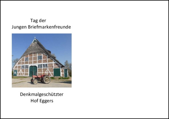 Am Informationsstand kann ein Sonderumschlag erworben werden. Er zeigt ein historisches Hofgebäude zusammen mit einem Traktor und kostet 2,00 € zzgl. Porto und Verpackung. Ansprechpartner der Veranstaltung ist Werner Heitmann, Telefon 040/79410839, Mail: