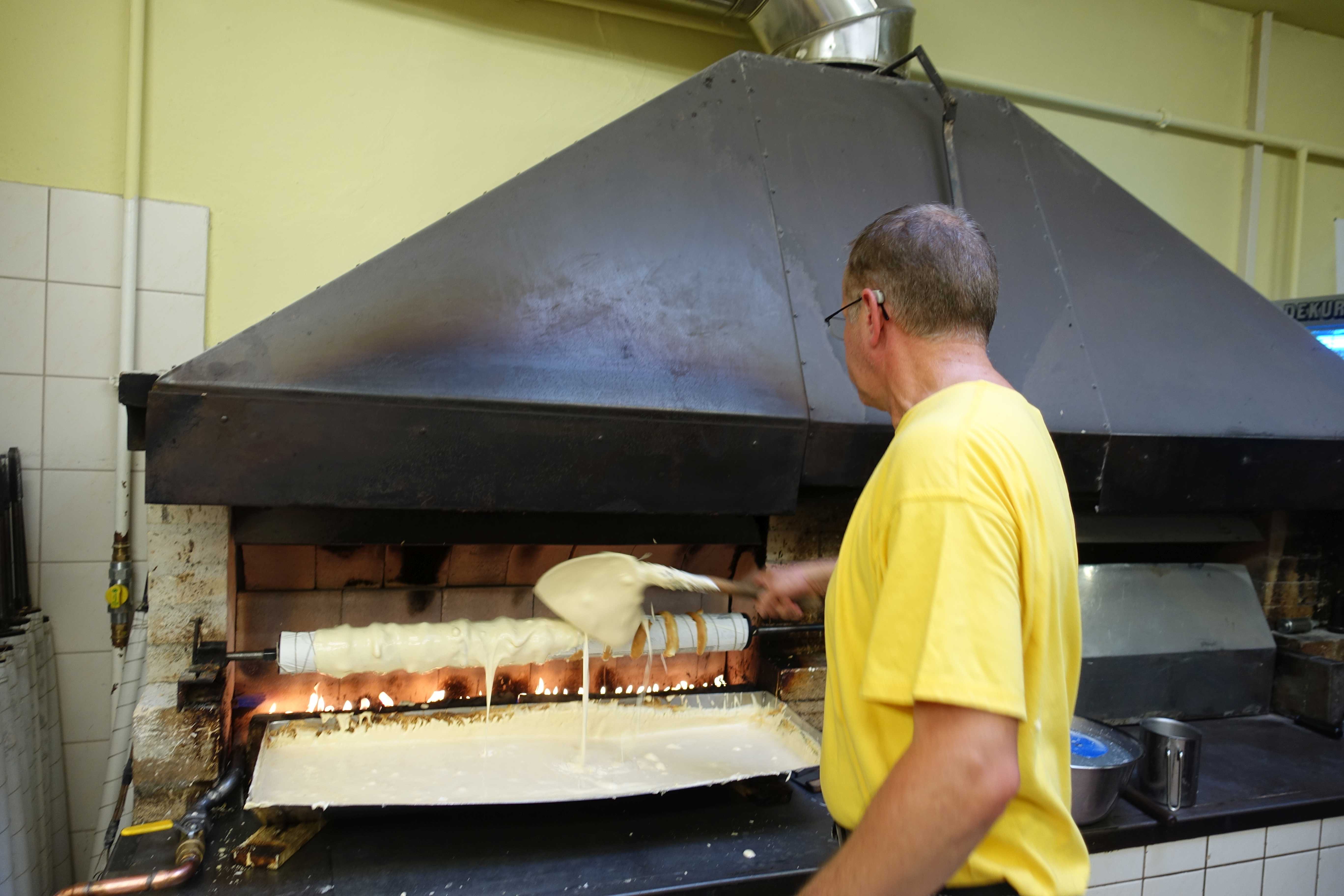 Ein Baumkuchenbäcker beim Herstellen der Baumkuchen