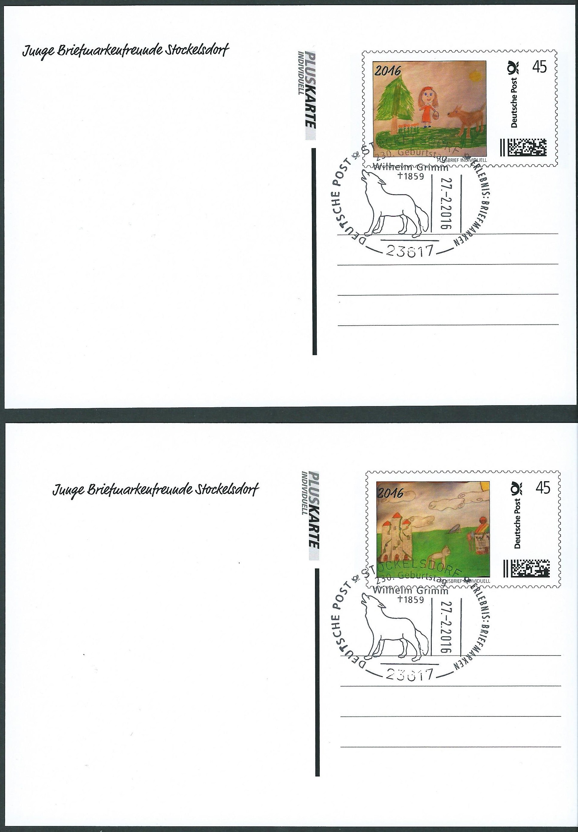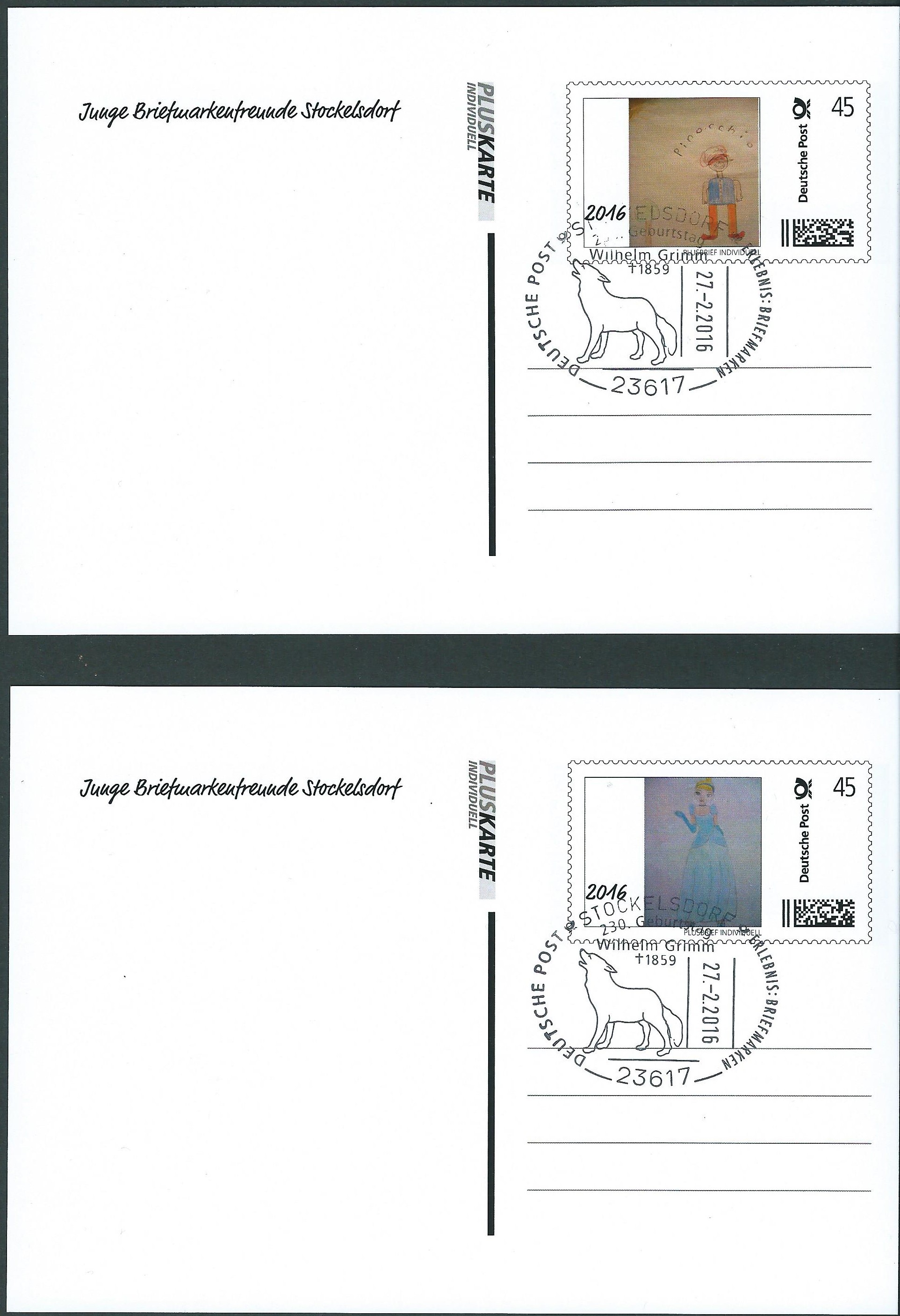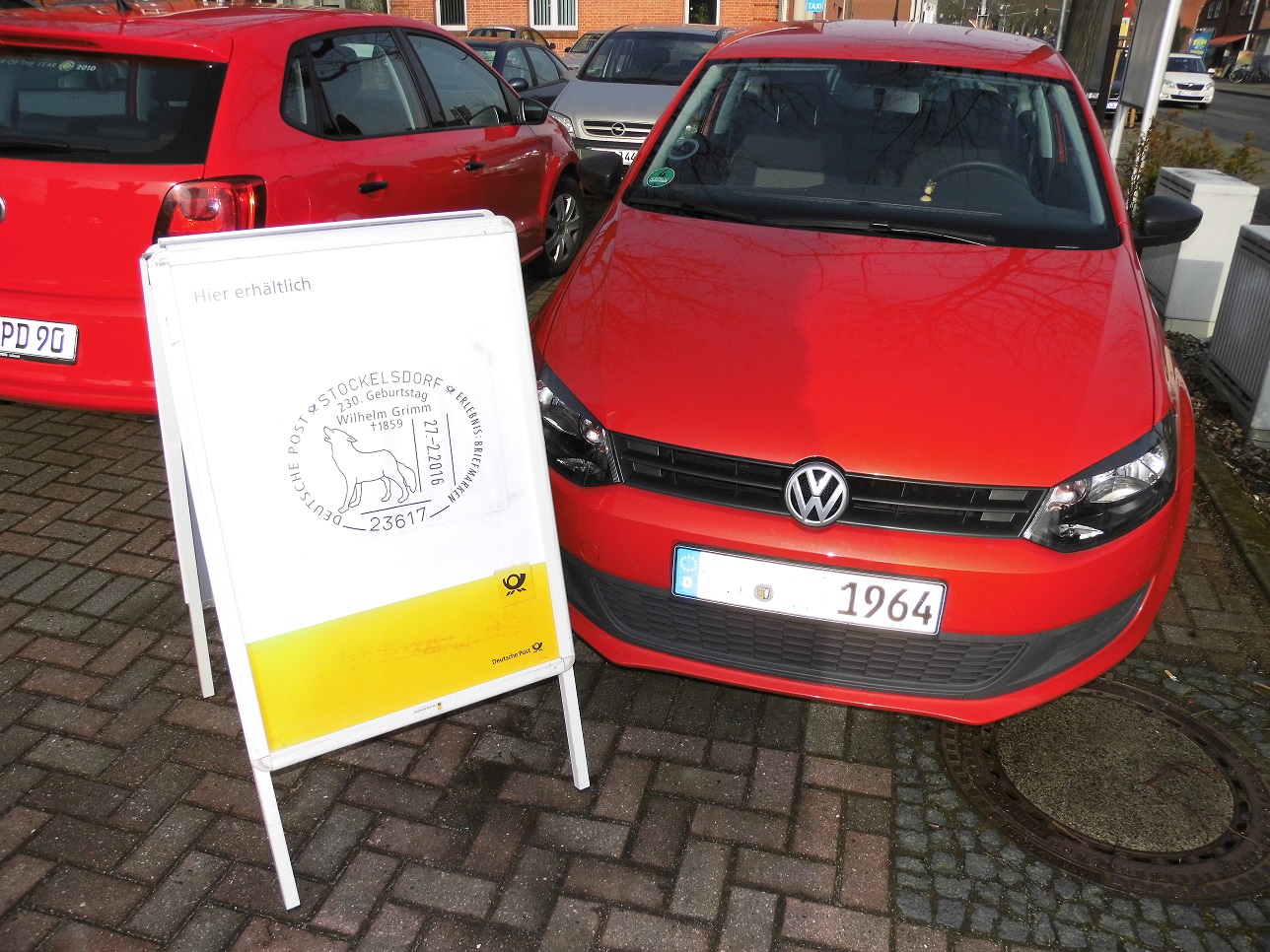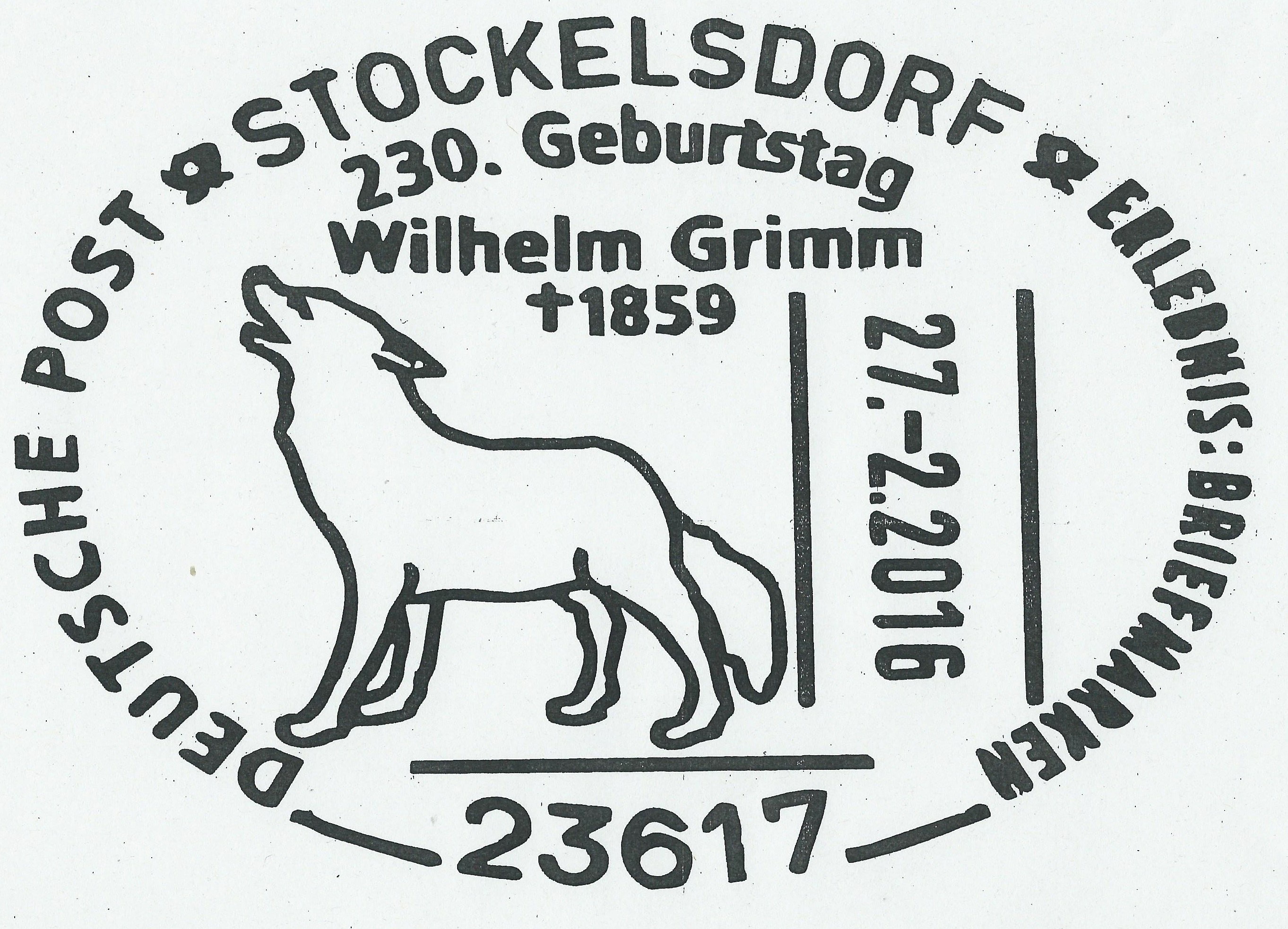 Dazu gibt es noch eine weitere Attraktion: Den allerersten Sonderstempel aus Stockelsdorf!!! Unser Jugendgruppenleiter hat keine Kosten und Mühen gescheut und den hier abgebildeten Sonderstempel organisiert. Und irgendwie passt er auch zu den am 11.2.16 verausgabten Märchen-Wohlfahrtsmarken, da er das Thema Grimm und als Abbildung einen Wolf zeigt. Zu diesem Thema war auch ein örtlicher Malwettbewerb ausgerufen, dessen Preisverleihung ebenfalls am 27.2. vor Ort stattfinden wird.