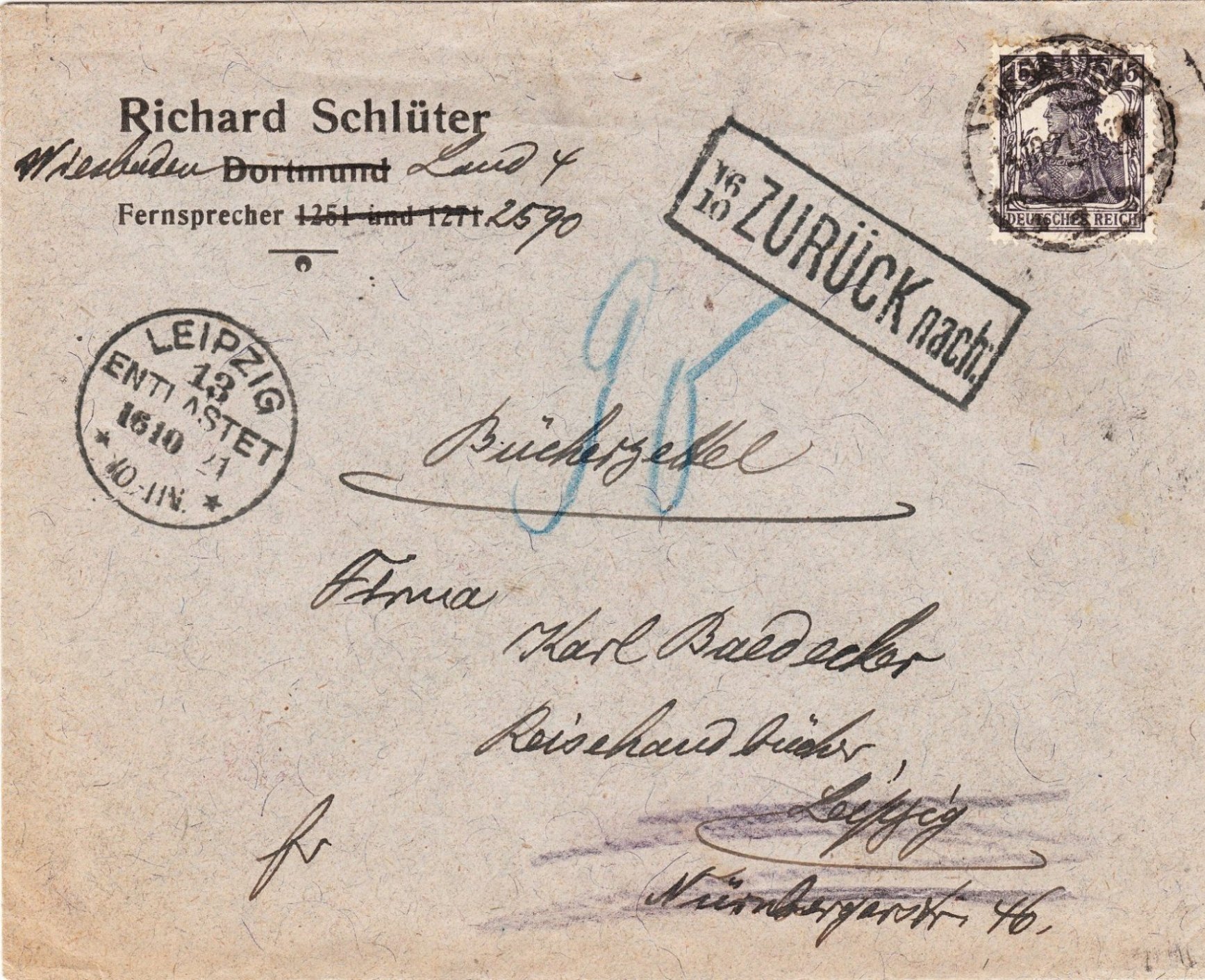 Die Sendung wurde am 14.10.1921 frankiert mit 15 Pfennig Germania als Sendungsart "Bücherzettel" in Briefform = nicht zugeklebter Umschlag in Wiesbaden aufgegeben.