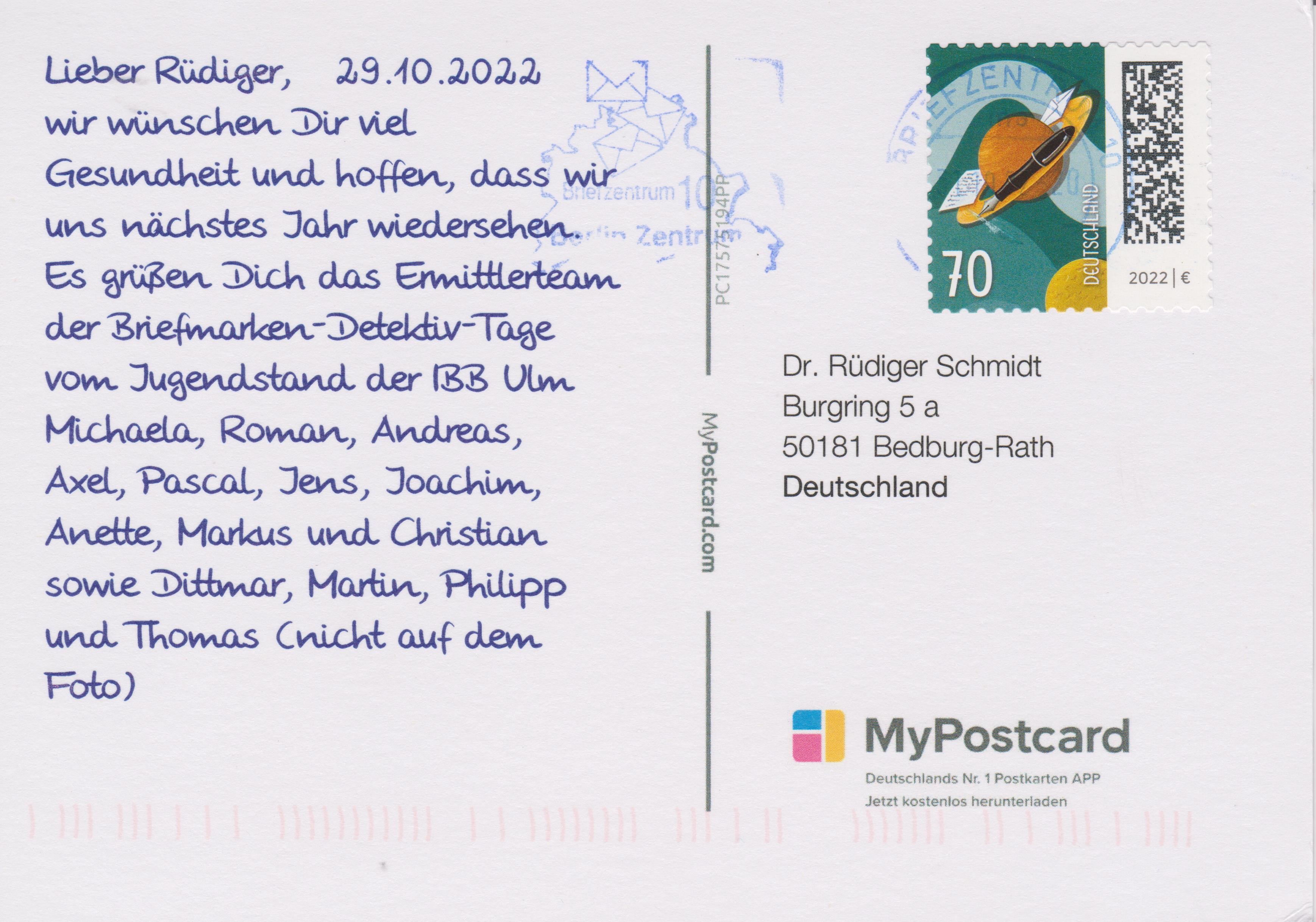 Sehr gefreut habe ich mich darüber, daß unsere jungen Sammlerfreunde trotzdem an mich gedacht und mir diese Postkarte geschickt haben: