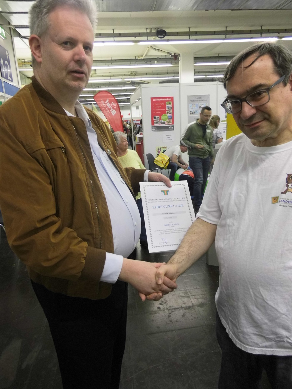 In diesem Jahr wurden wieder 3 Ehrungen für liebe Menschen vorgenommen, die sich für die Jugendarbeit besonders hervorgehoben haben. Ich bitte um Entschuldigung, dass ich sie hier nicht namentlich erwähnen kann, aber ich habe meinen Spickzettel mit den Daten irgendwie unauffindbar verbummelt. Vermutlich habe ich ihn am Stand irgendwo untergebuddelt, als ich eine Forumsberatung durchgeführt habe. Daher bitte ich einmal um Nachreichung der Namen der Geehrten durch den Vorstand. Auf jeden Fall sollen aber hier die Geehrten im Bild gezeigt werden: