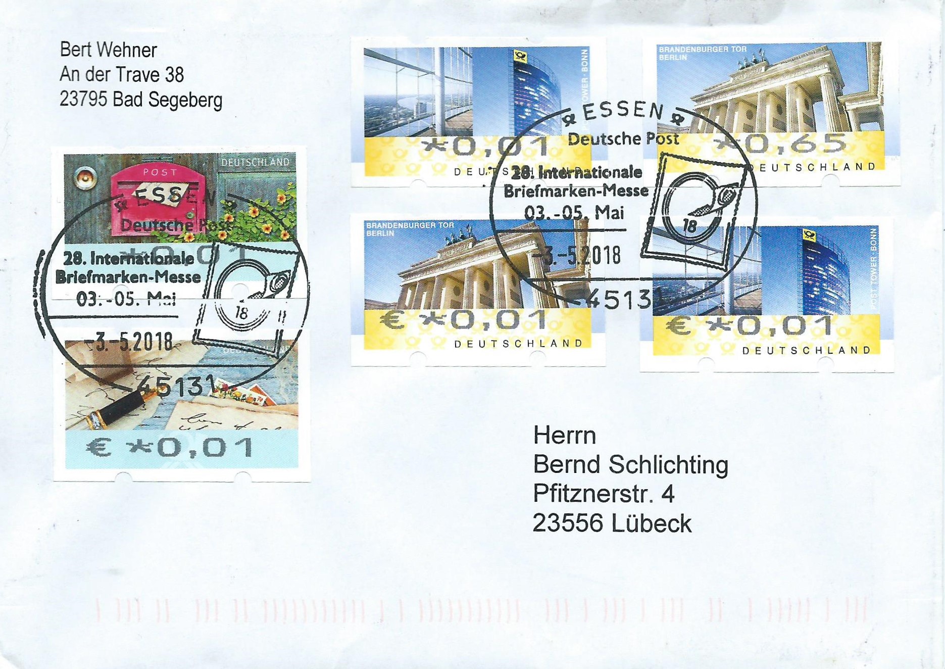 Heute kam sogar schon ein Beleg mit Sonderstempel von der Messe bei mir an, obwohl da überall dran stand, dass Belege erst ab dem 7.5. von dort aus bearbeitet und befördert werden, und das ist heute! Da haben sich die Postler ja selber übertroffen. Dem geübten Auge wird sicherlich auffallen, dass 3 Marken Besonderheiten aufweisen. Es sind die unteren 3 Marken, die noch im Wertaufdruck das €-Zeichen haben! Das gehört da ja schon lange nicht mehr hin, die letzte Marke war die ATM 5 mit dem Briefkastenmotiv, die diesen Werteindruck (allerdings im oberen Teil) hatte.
