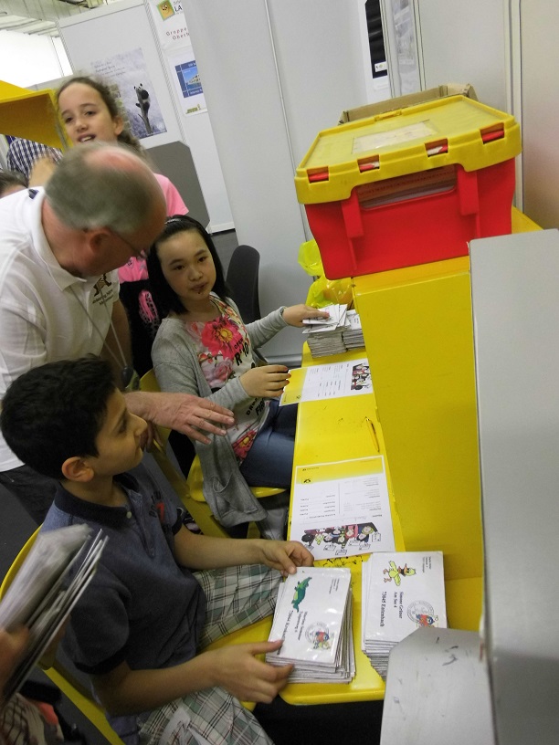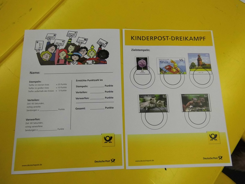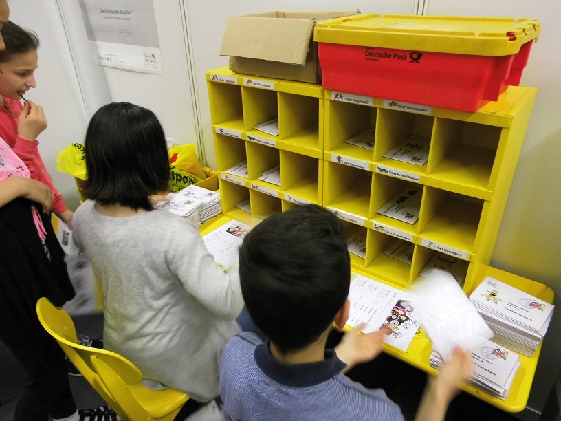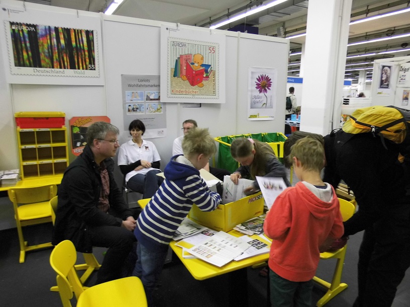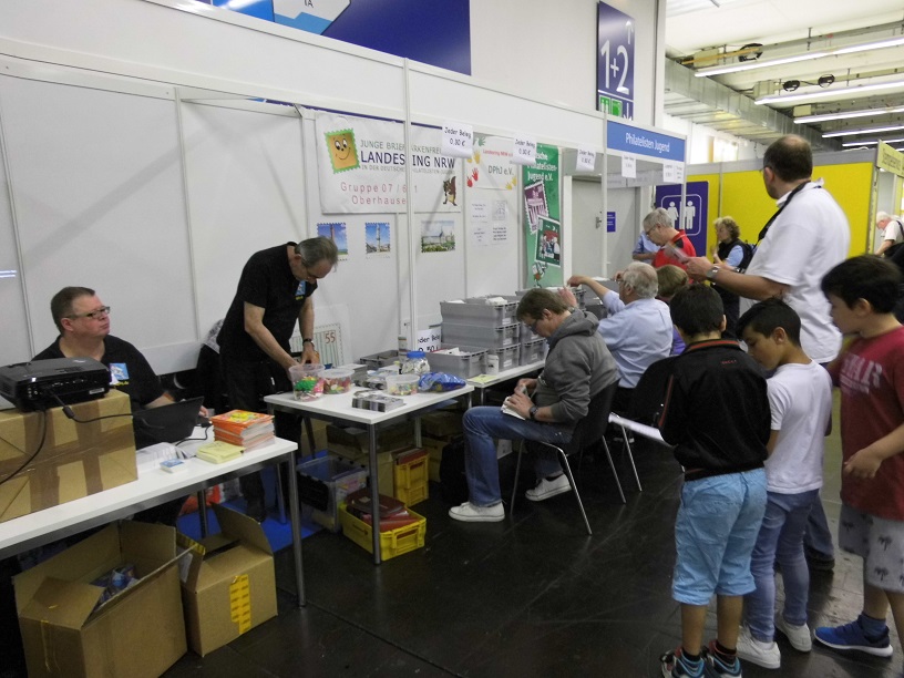 Kurz gesagt, es war wieder einmal einfach nur SUPER!!! Und klar, die Zeit ist viel zu schnell vorbei gegangen. Eben hatten wir noch Mittwoch den Aufbau erledigt und uns 3 Mal umgedreht, war schon wieder Samstag-Nachmittag 17 Uhr und alles vorbei. Dabei hatten Ralf und seine Gruppenkollegen von den Jungen Briefmarkenfreunden Landesring NRW sich so viele tolle Sachen einfallen lassen! Der „normale“ Stand ist ja ohnehin jedes Jahr gesetzt, doch dieses Jahr hatten wir als Attraktion die Kinderpost, womit die Kinder und Jugendlichen einmal selber Postmitarbeiter sein konnten. Hier wurde ein „3-Kampf“ organisiert, welcher das Abstempeln von Marken, Verteilen von kleiner Briefpost in entsprechende Sortierfächer und Werfen von grossen Briefpoststücken in Postsäcke beinhaltete. Und alle kleinen Postmitarbeiter waren mit Feuereifer bei der Sache! Hier einige Impressionen aus der Kinderpost: