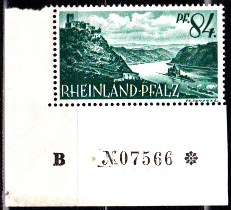 Eckrandstück vom linken unteren Bogenrand. Unterhalb der linken unteren Marke im Bogen befindet sich bei grossformatigen Marken der Französischen Zone immer die Bogenzählnummer. Vorangestellt ist jeweils der Buchstabe A oder B zur Unterscheidung der jeweils nebenander gedruckten Bogenpaare. Hier handelt es sich um den rechten Bogen, der jeweils der "B"-Bogen ist.