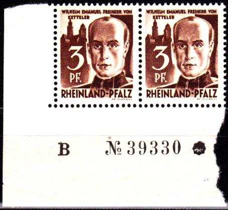 Eckrandpaar vom linken unteren Bogenrand. Unterhalb dieser beiden Marken befindet sich bei kleinformatigen Marken der Französischen Zone immer die Bogenzählnummer. Vorangestellt ist jeweils der Buchstabe A oder B zur Unterscheidung der jeweils nebenander gedruckten Bogenpaare. Hier handelt es sich um den rechten Bogen, der jeweils der "B"-Bogen ist.