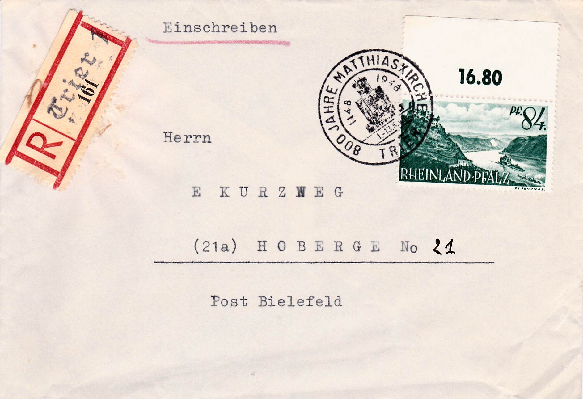 Eckrandstück vom linken unteren Bogenrand. Unterhalb der linken unteren Marke im Bogen befindet sich bei grossformatigen Marken der Französischen Zone immer die Bogenzählnummer. Vorangestellt ist jeweils der Buchstabe A oder B zur Unterscheidung der jeweils nebenander gedruckten Bogenpaare. Hier handelt es sich um den rechten Bogen, der jeweils der "B"-Bogen ist.
