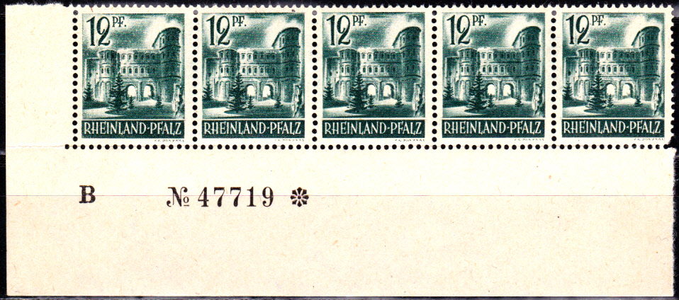 Fünferstreifen vom linken unteren Bogenrand. Unterhalb der beiden linken Marken befindet sich bei kleinformatigen Marken der Französischen Zone immer die Bogenzählnummer. Vorangestellt ist jeweils der Buchstabe A oder B zur Unterscheidung der jeweils nebenander gedruckten Bogenpaare. Hier handelt es sich um den rechten Bogen, der jeweils der "B"-Bogen ist.