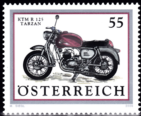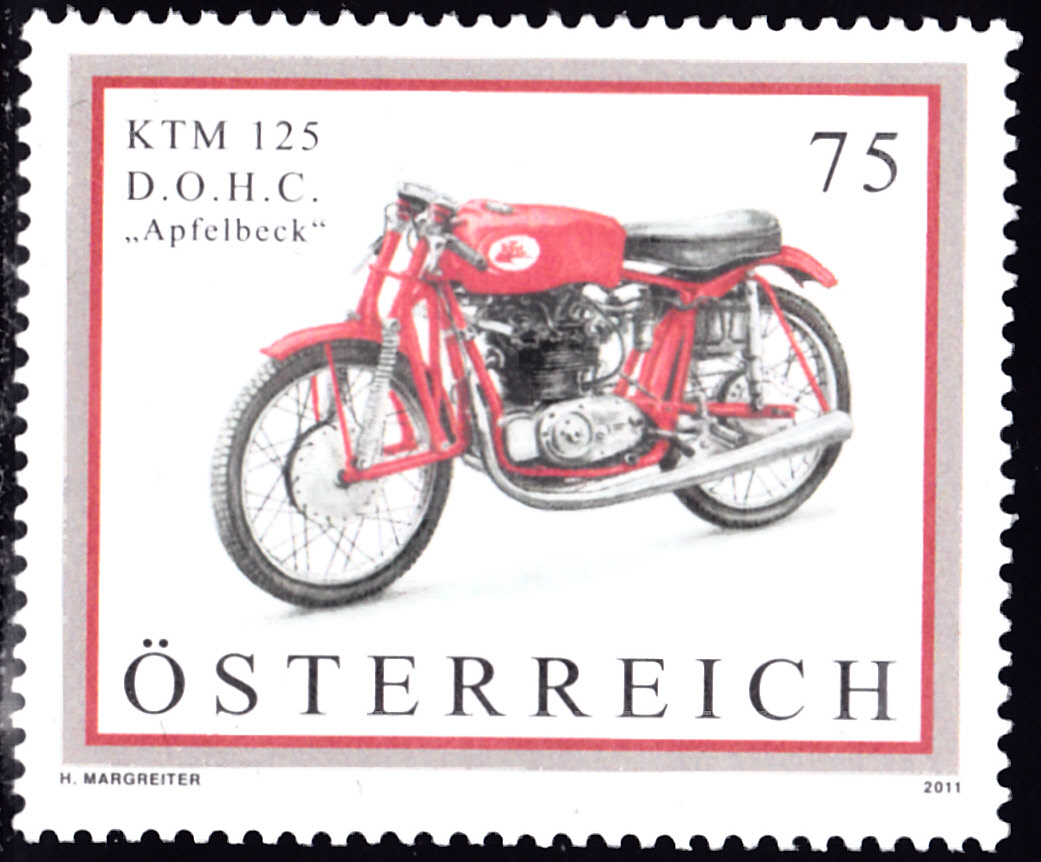 In der Serie "Motorräder" ist in Österreich diese Marke (MiNr 2914) mit der Rennmaschine KTM 125 D.O.H.C. "Apfelbeck" erschienen.