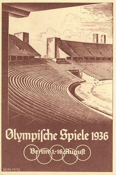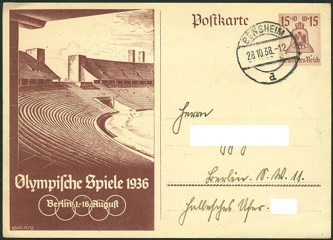 hier wieder eine gelaufene P 259, aufgegeben am 11.08.1936 um 12 Uhr in BERLIN OLYMPIA-STADION, Handwerbestempel mit Kennbuchstabe "q":