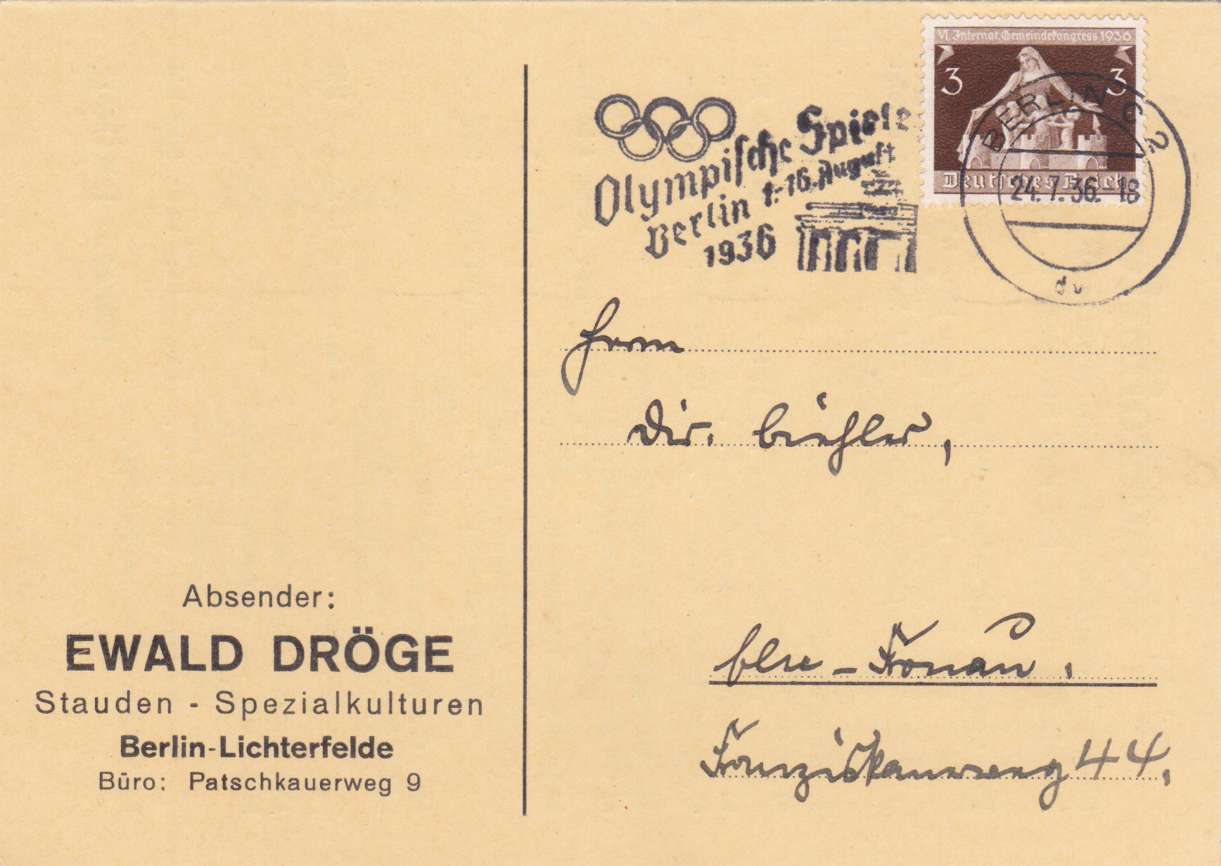 Es folgt ein Stempel vom 29.7.1936 aus Berlin-Charlottenburg 2 auf einer Bildpostkarte.