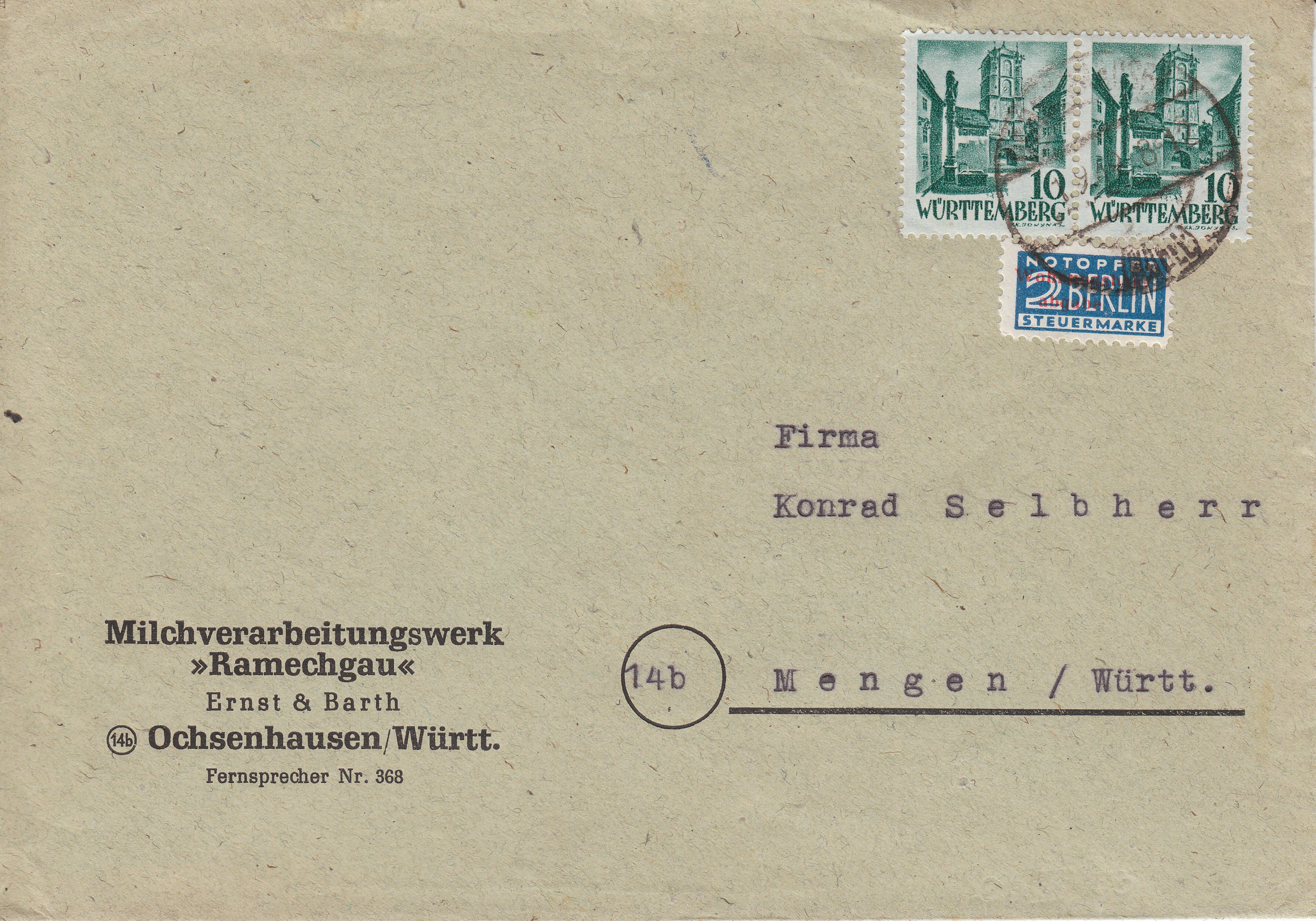 MeF der MiNr. 33 in Form eines Paares, am 01.09.1949 portorichtig auf Fernbrief (20 Pf), dazu die obligatorische Wohnungsbaumarke, hier eine Nr. 2 b C z Type III, ''a'' unter ''oh''.