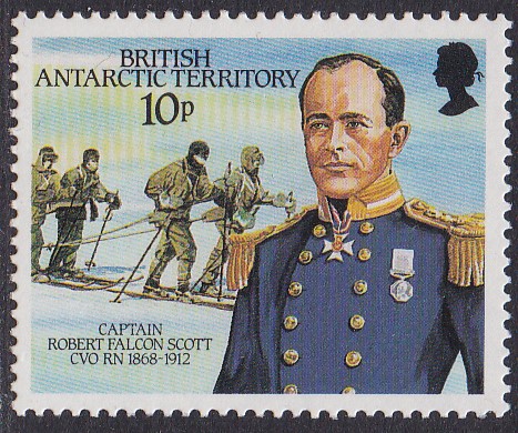 Zum 75. Jahrestag der Ankunft von Robert Falcon Scott am Südpol erschien am 19.3.1987 eine Serie von vier Marken. auf der Marke zu 10 Pence (MiNr 140) wird R. F. Scott vor weiteren Expeditionsteilnehmer gezeigt.