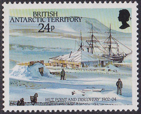 Die Marke zu 24 Pence (MiNr 141) der Serie "75. Jahrestag der Ankunft von Robert Falcon Scott am Südpol" zeigt das Segelschiff "Discovery" am "Hut Point".
