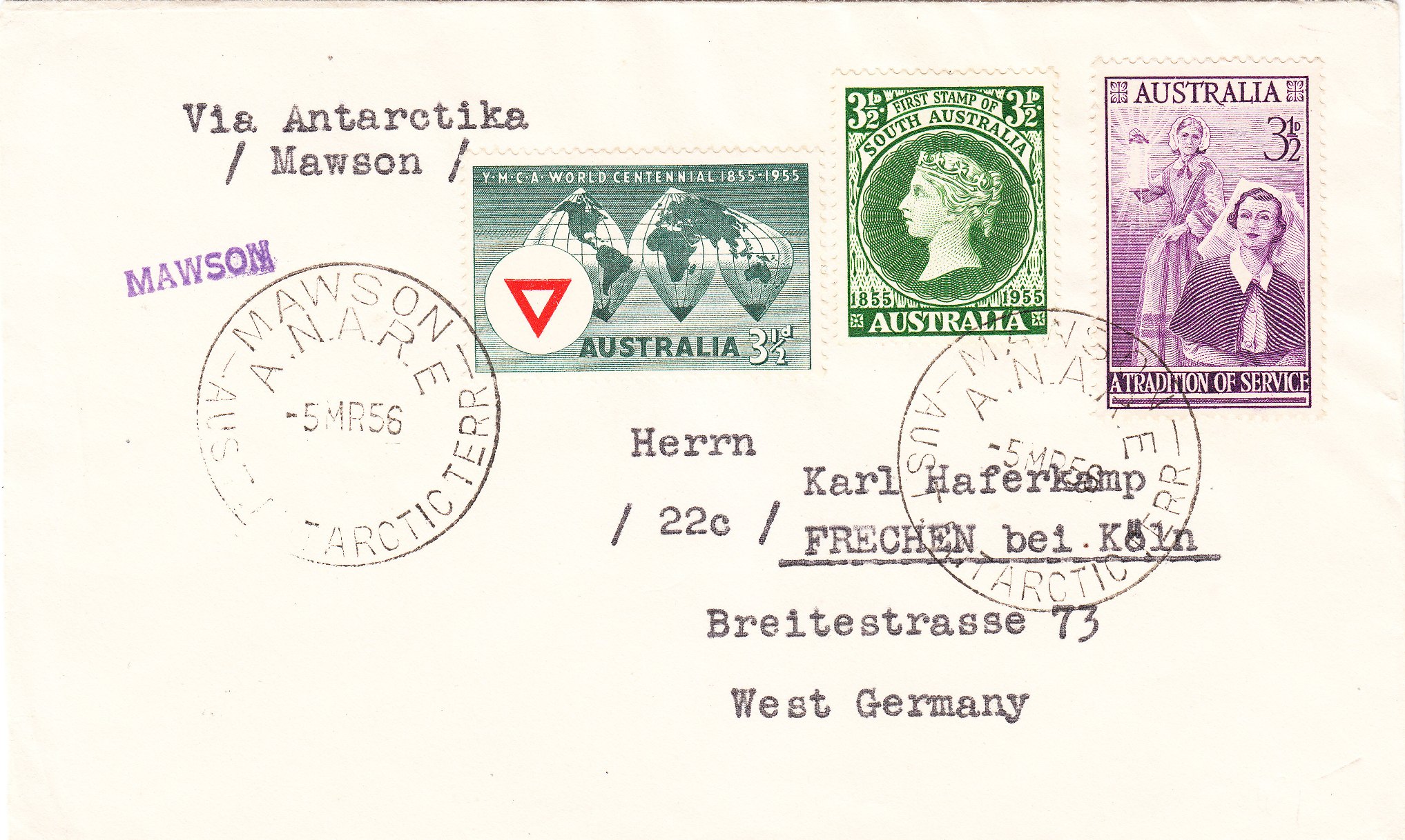 Dieser Beleg mit australischer Frankatur wurde am 05.03.1956 gestempelt "MAWSON - AUST. ANTARCTIC TERR - A.N.A.R.E":