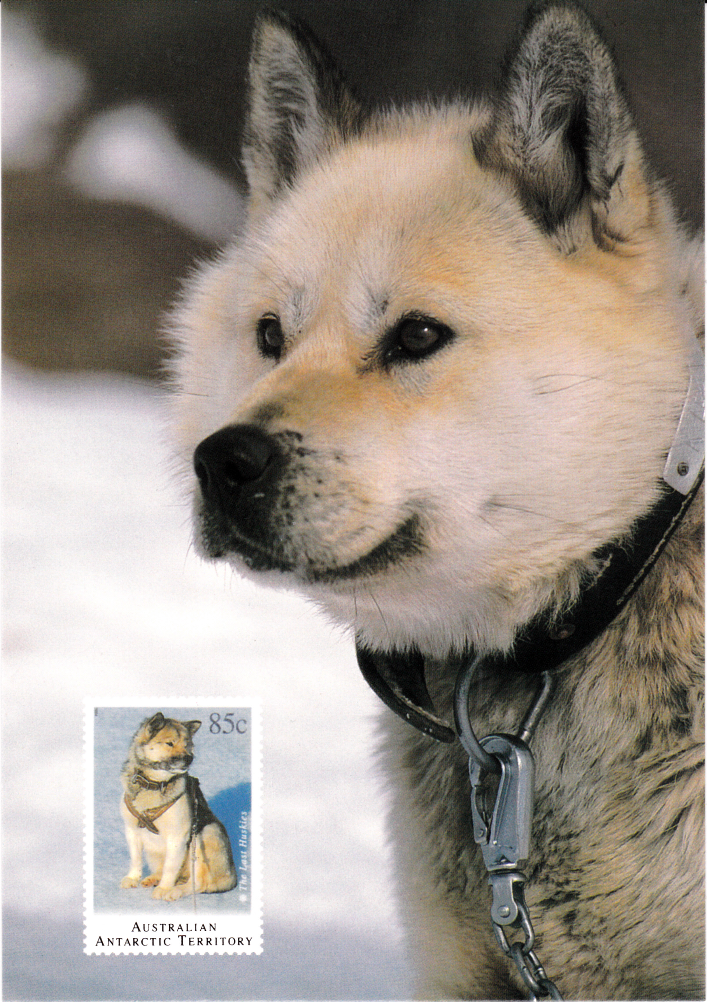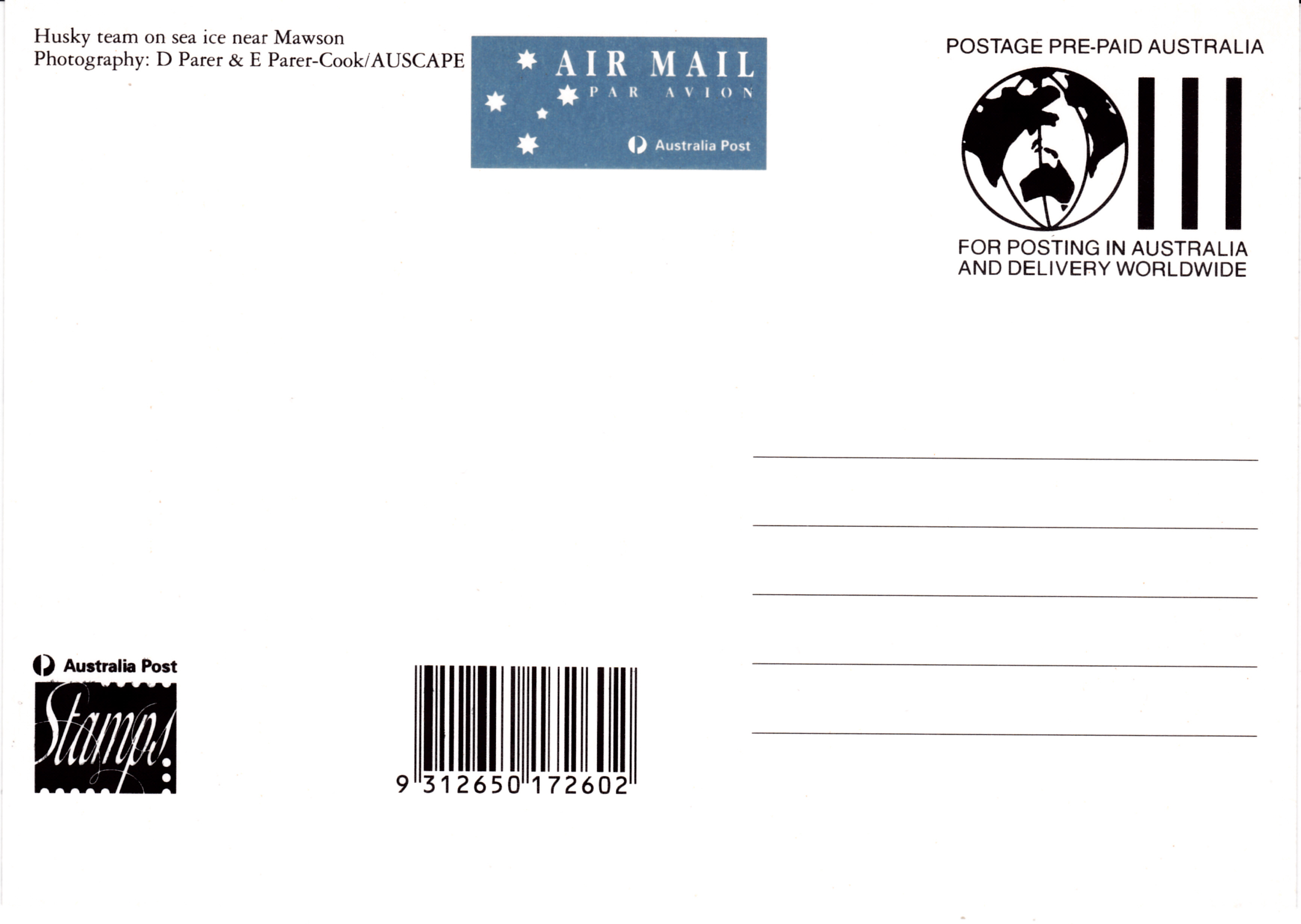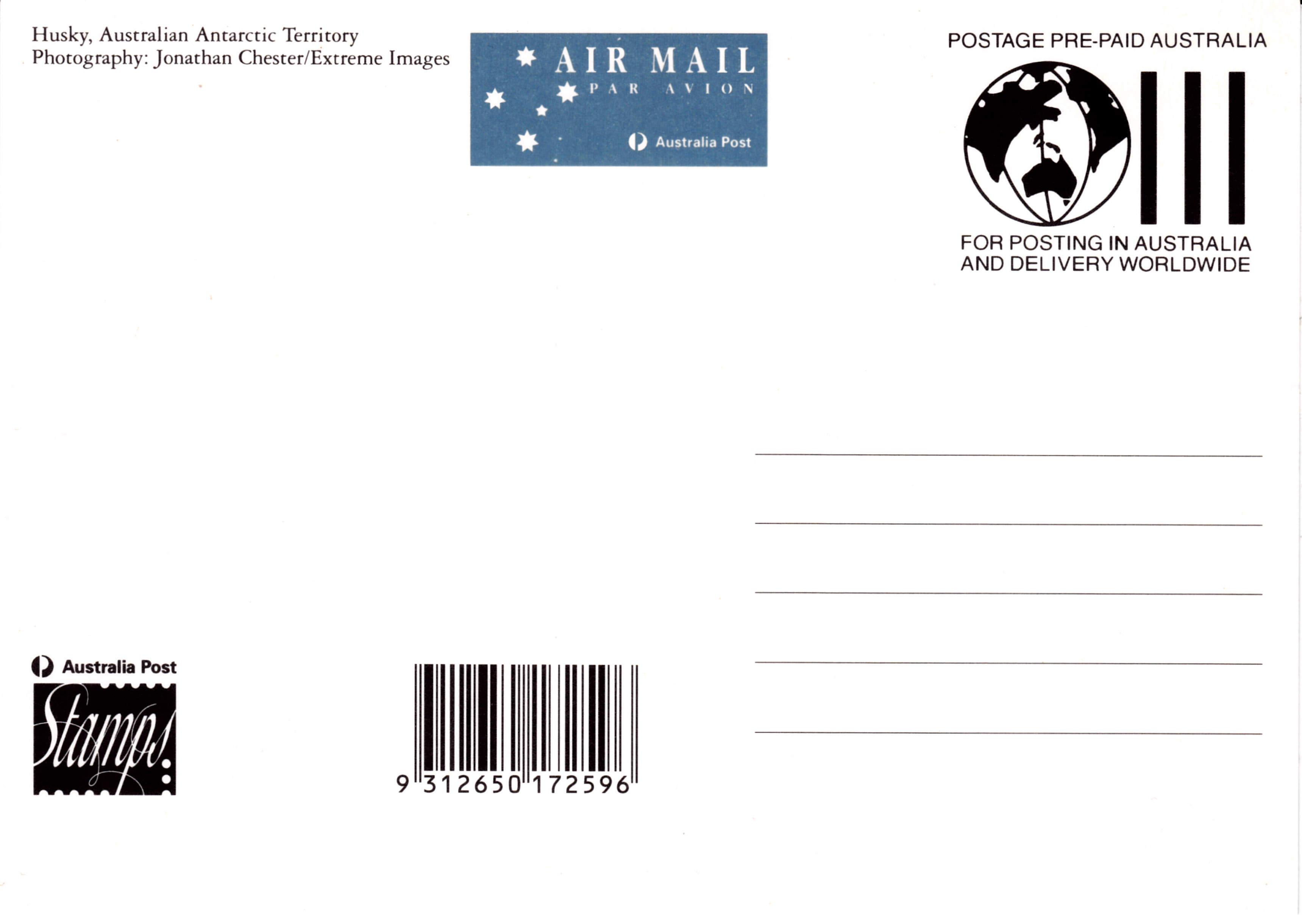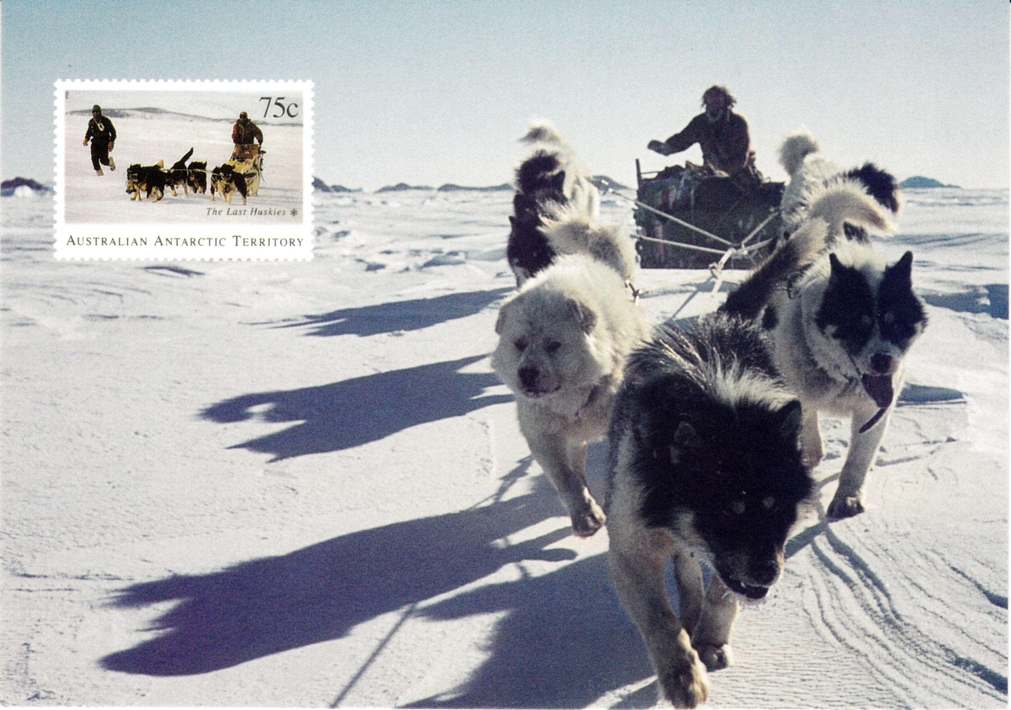 Zu dieser Serie "Beschluss zur Entfernung der Schlittenhunde aus der Antarktis wegen der Gefahr von Seuchenübertragung" gibt es auch Ganzsachen. Die Postkarten zeigen auf der Bildseite eine zur jeweiligen Marke passende Abbildung und die Marke.