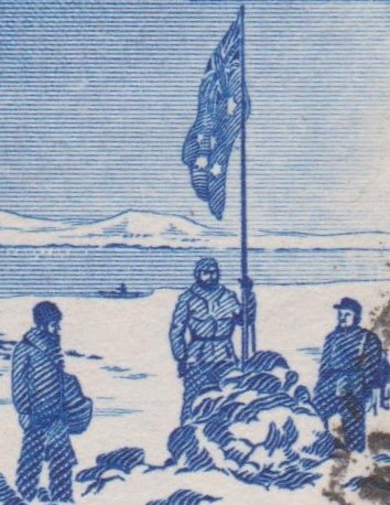 Im Markenbild wird die Hissung der australischen Flagge durch Peter Shaw (Meteorologe), Phillip Garth Law (vom Außenministerium) und Arthur Montagu Gwynn (Ornithologe) sowie eine Karte der Antarktis gezeigt: