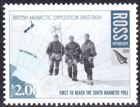 Eine weitere Marke (MiNr 112) zeigt Mackay, David und Mawson am antarktischen magnetischen Pol bei 72° 15′ S, 155° 16′ O am 16. Januar 1909. Michel schreibt zum Motiv der Marke "Erreichen des magnetischen Südpols (9.1.1909)".