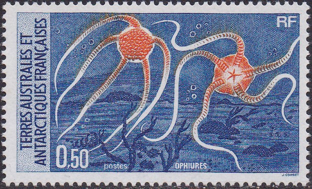 Die zweite Marke (MiNr 224) aus der Serie "Pflanzen der Antarktis" der Französischen Gebieten der Antarktis bildet eine Flechte (Neuropogon taylori) ab.