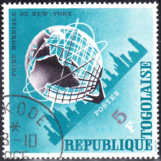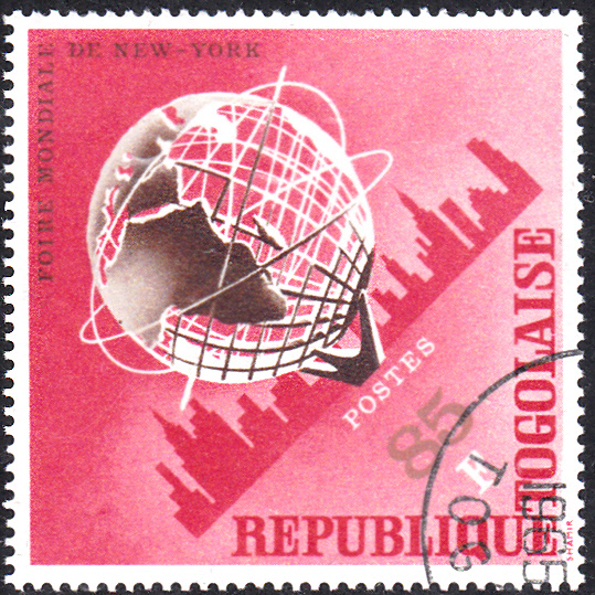 In Togo erschien zu dieser Weltausstellung eine Serie mit fünf Marken. Hier die Marke zu 5 Fr (MiNr 477 A) mit einer Unisphäre und der Skyline von New York.