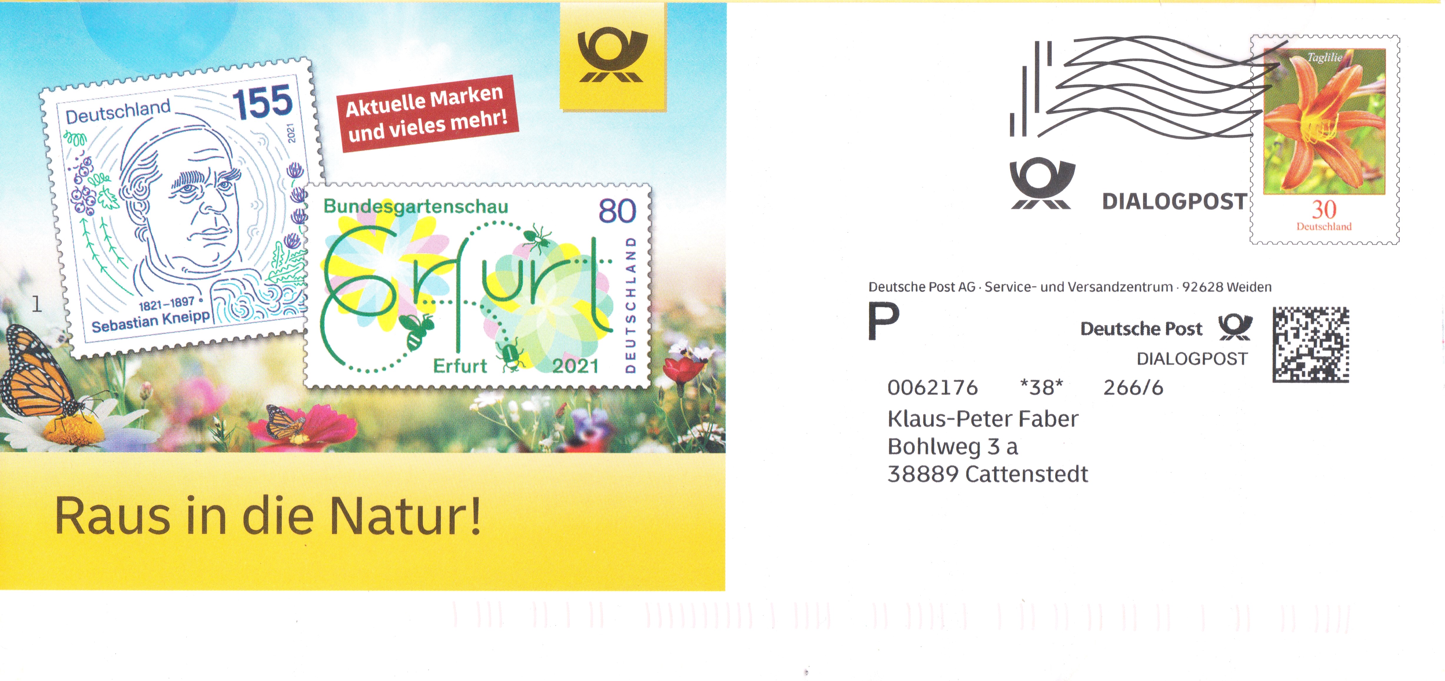 Klappkarte des Vorstandsvorsitzenden der Deutschen Post AG mit der Marke zur Bundesgartenschau 2021 in Erfurt (MiNr 3600) und dem Ersttagsonderstempel Bonn.