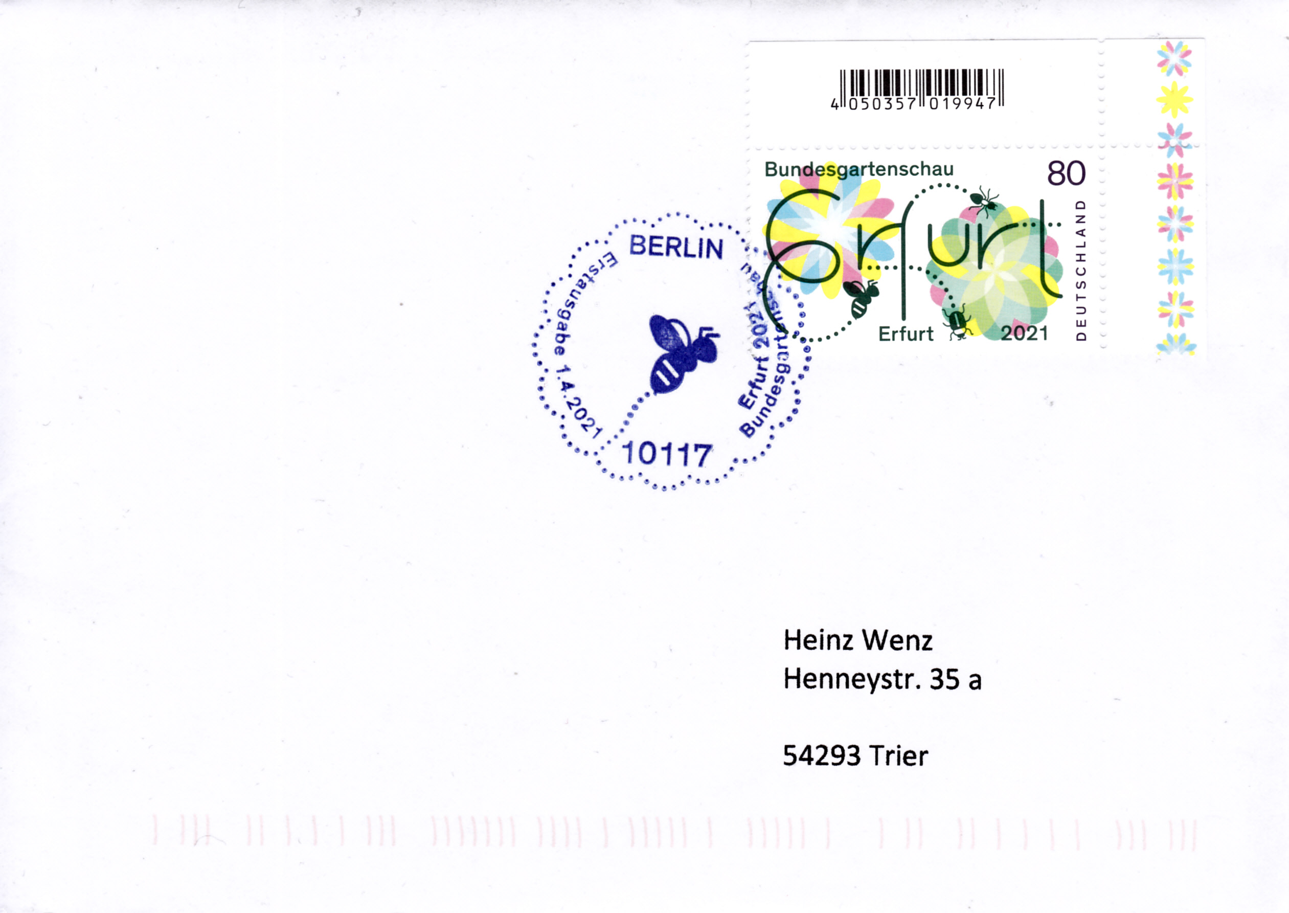 Auf diesem Brief wurde die Marke am Ersttag mit einem Sonderstempel aus Erfurt zur Bundesgartenschau gestempelt.