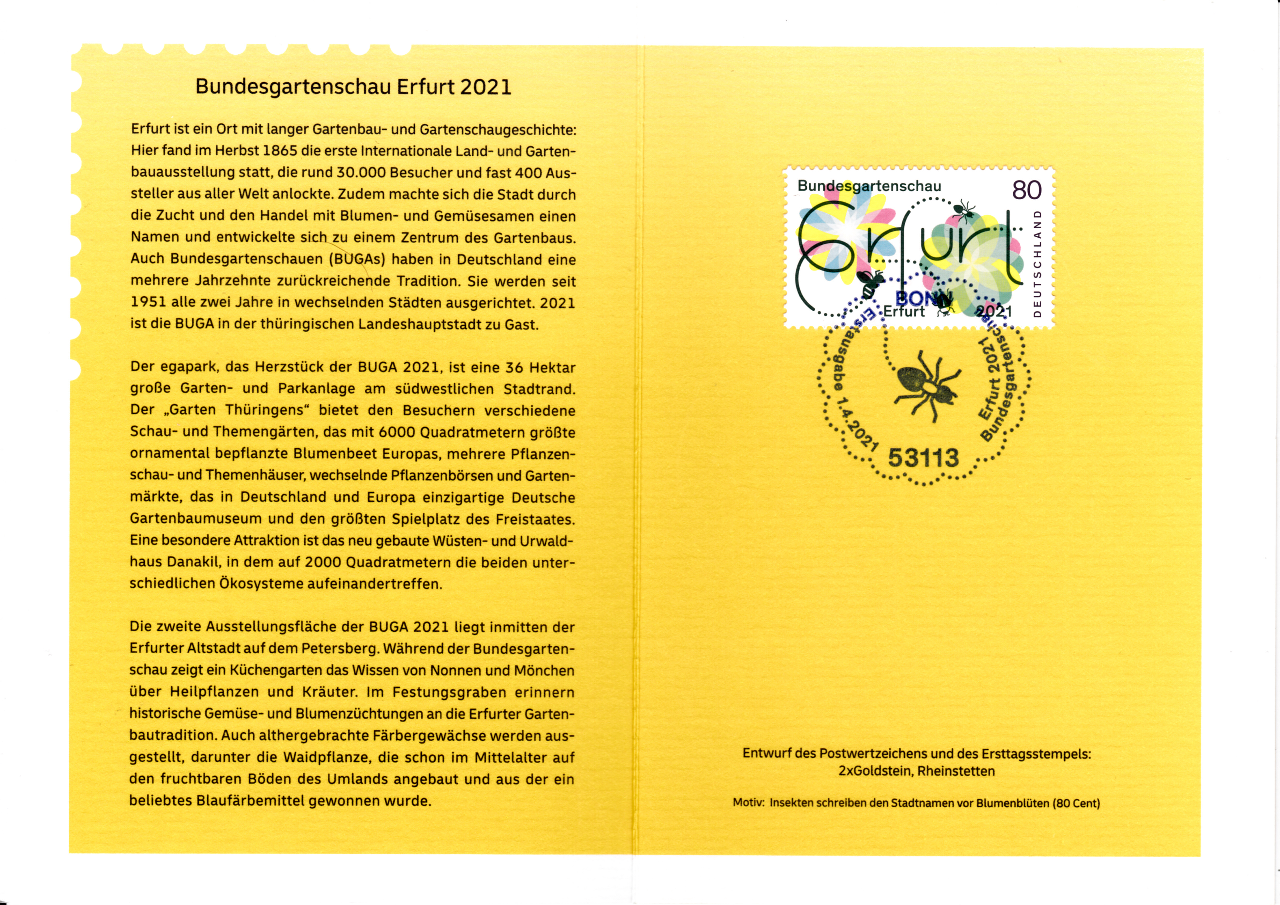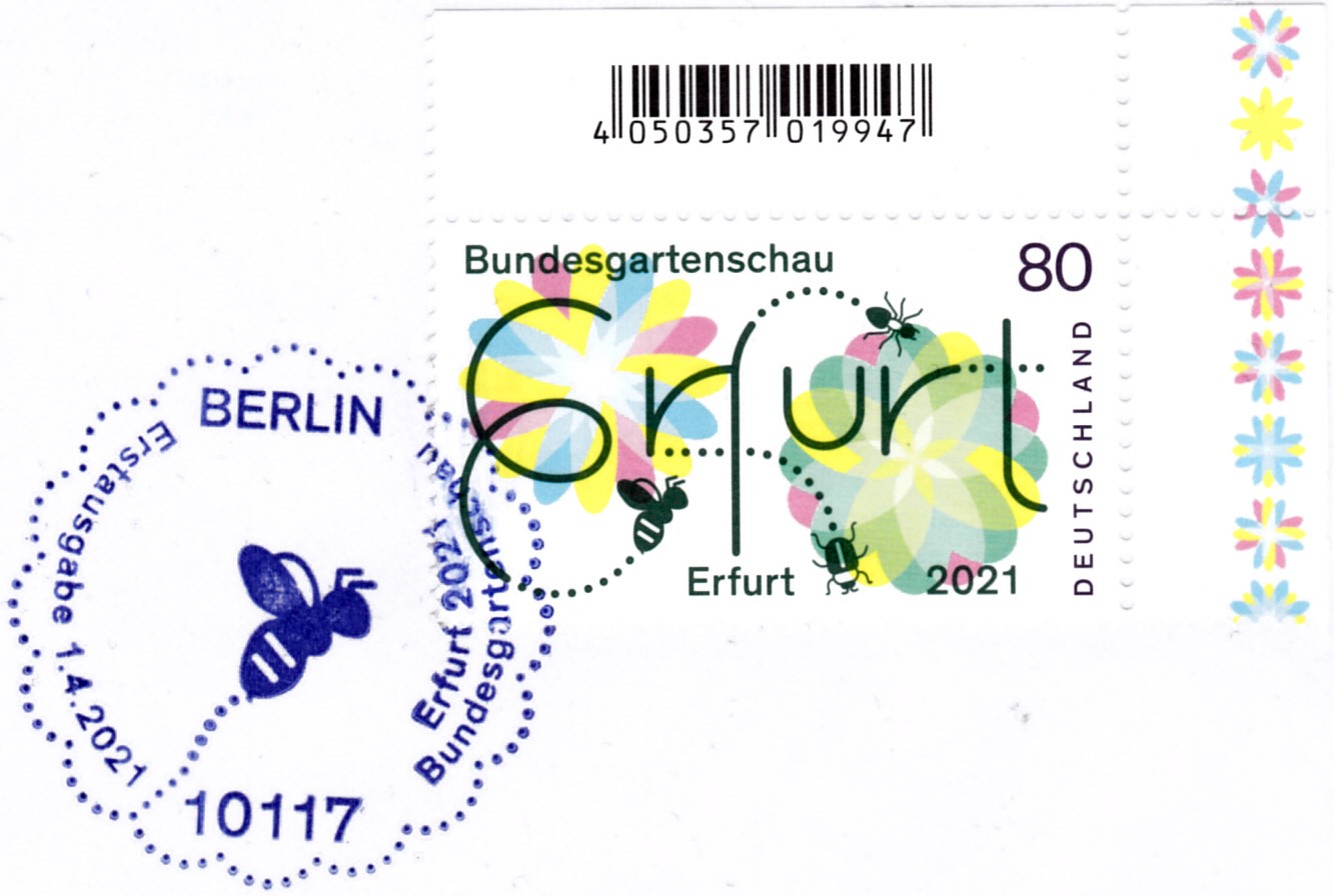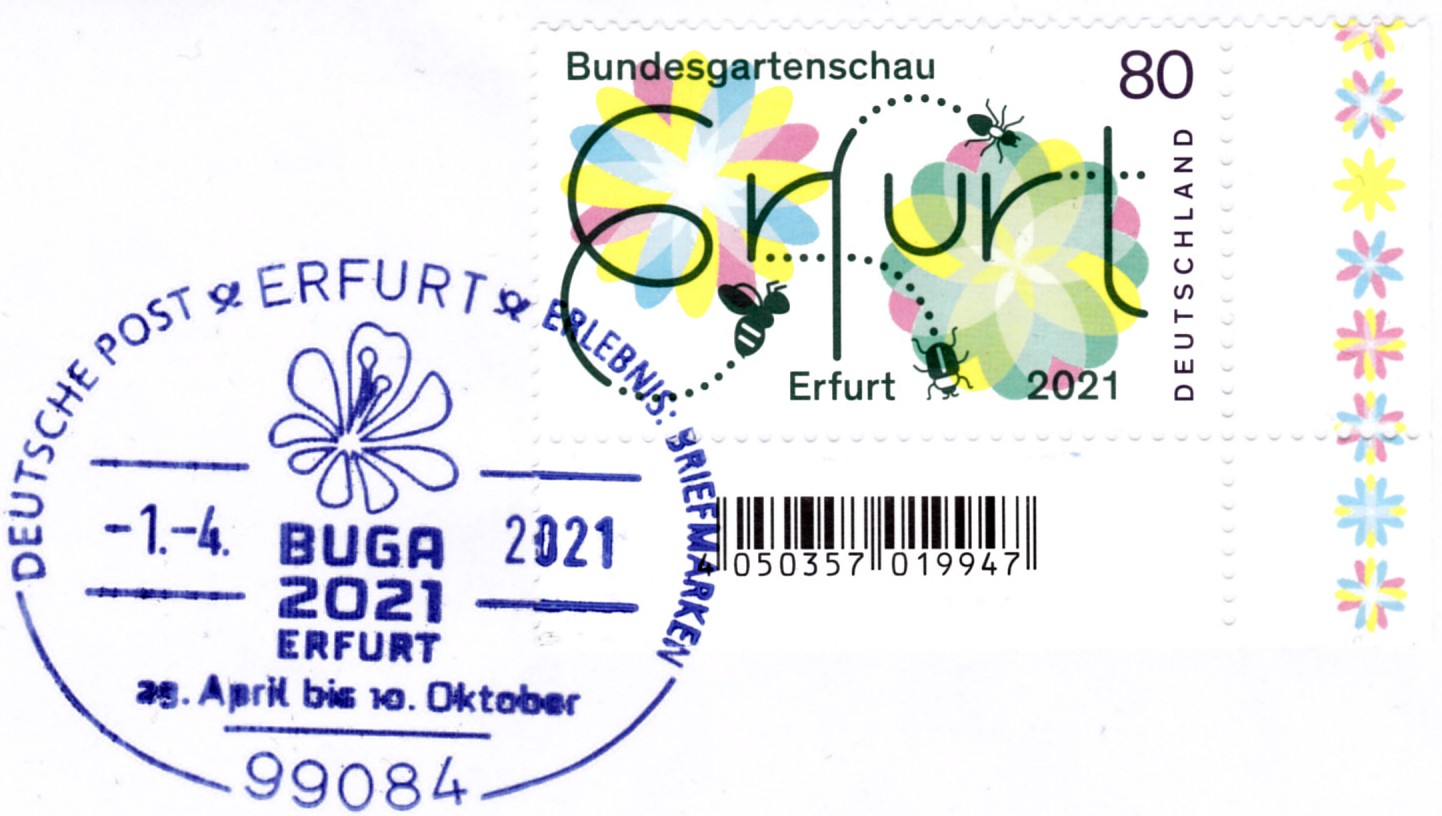 Zur Bundesgartenschau 2021 in Erfurt ist bei der Deutschen Post eine Marke (MiNr 3600) mit dem Schriftzug "Erfurt" mit Insekten Rosetten.