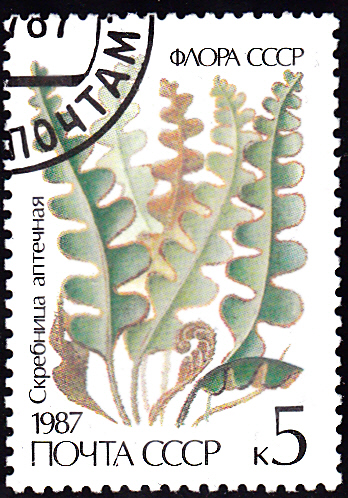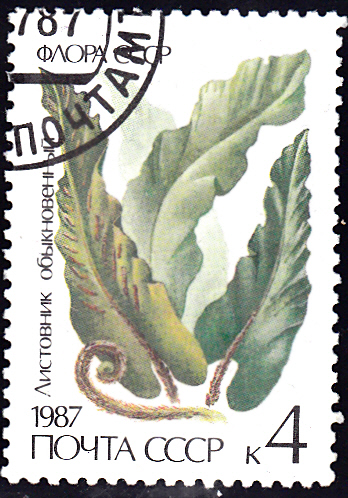 Aus der Sowjetunion kommt diese Marke (MiNr 5729) mit einem Hirschzungenfarn (Asplenium scolopendrium). Michel nennt als Namen Hirschzunge (Scolopendrium vulgaris).