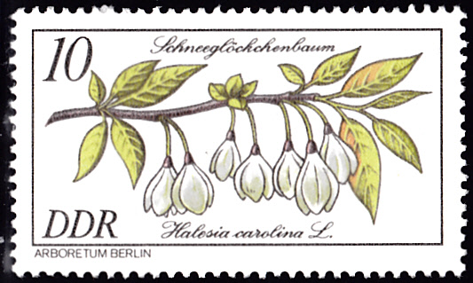 Auf dieser Marke der DDR (MiNr 2574) ist ein blühender Zweig eines Carolina-Schneeglöckchenbaumes (Halesia carolina) abgebildet.