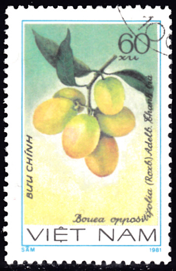 Die Burmesenpflaume (Bouea oppositifolia) ist eine Art der Gattung Bouea in der der Familie der Sumachgewächse (Anacardiaceae). Sie wächst als immergrüner, dichtbelaubter Baum mit Wuchshöhen bis ca. 43 m (in Kultur bis zu 20 m). Sie wächst in Südostasien. Hier zeige ich eine Marke aus Vietnam (MiNr 1185) mit einem Zweig der Burmesenpflaume (Bouea oppositifolia) mit Früchten.