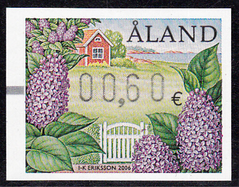 Der Vordruck der Automatenmarke der Aland-Inseln des Jahres 2006 (MiNr 17) zeigt Blüten des Gewöhnlichen Flieder.
