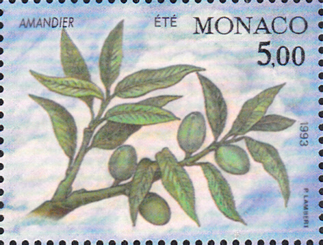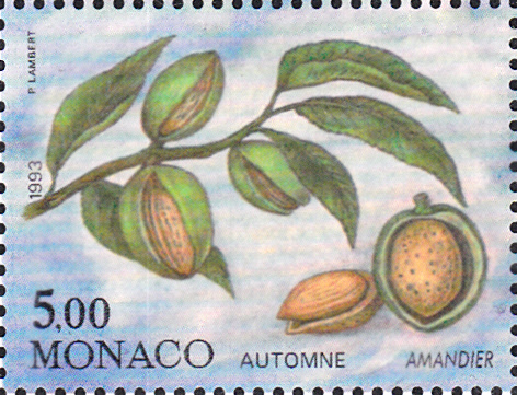Auf der dritten Marke aus Monaco (MiNr 2102) sehen wir einen Zweig eines Mandelbaumes (Prunus amygdalus) im Herbst mit den reifen Früchten.
