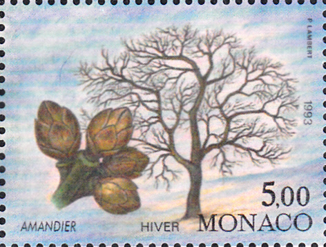 Diese Marke aus Monaco (MiNr 2100) zeigt den Zweig eines Mandelbaumes (Prunus amygdalus) im Frühling.
