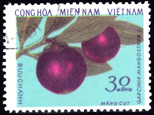 Eine Marke aus Vietnam, Ausgaben der Vietcong (MiNr 62) zeigt einen Zweig mit zwei Mangostanfrüchten (Garcinia mangostana).