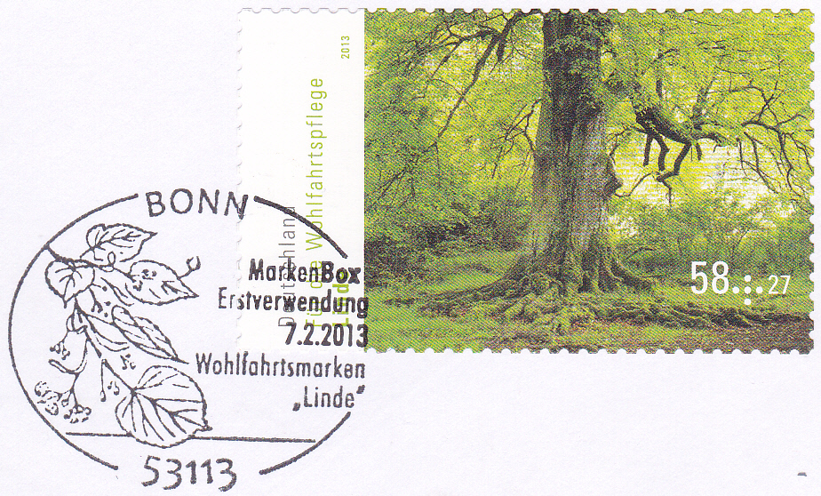 Brief vom Ersttag der selbstklebenden Wohlfahrtsmarke (MiNr 2986) mit der Linde und dem Erstverwendungsstempel Bonn.