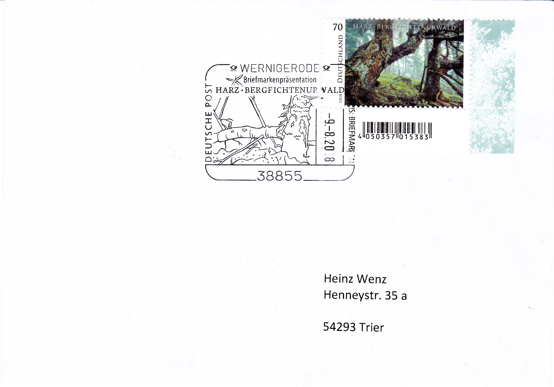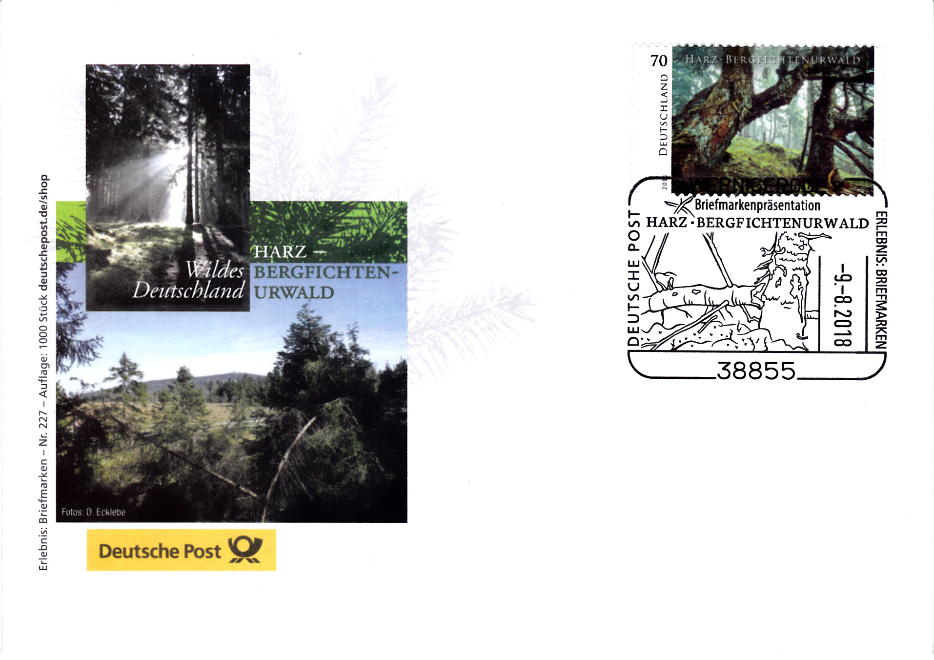 Über die EB-Teams der Deutschen Post wurden zur Markenpräsentation der Marke mit dem Bergfichtenurwald am Brocken im Harz Umschlage mit Zudruck und dem bereits hier gezeigten Sonderstempel aus Wernigerode vom 9.8.2018 verkauft.