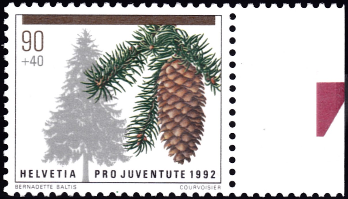 Auf dieser Marke aus der Schweiz (MiNr 1487) sehen wir eine Fichte (Picea abies) und einen Zweig mit Fichtenzapfen.