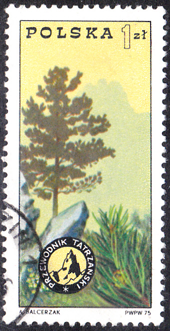 Aus Polen kommt diese Marke (MiNr 3456) mit einem Zweig mit Zapfen der Zirbelkiefer (Pinus cembra).