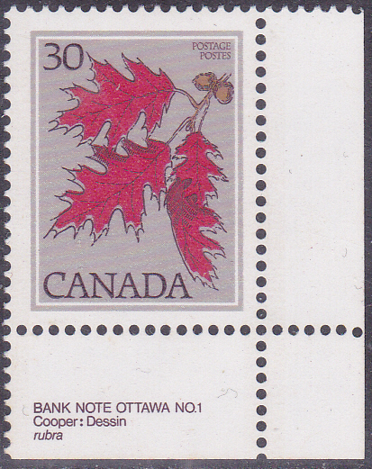 Auf einer Marke aus Kanada (MiNr 684) sehen wir ein Blatt der Roteiche (Quercus rubra). Michel nennt als Name Amerikanische Roteiche (Quercus rubra).