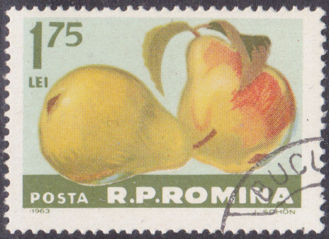 In Rumänien ist diese Marke (MiNr 2183) mit zwei Birnen (Pyrus domestica).