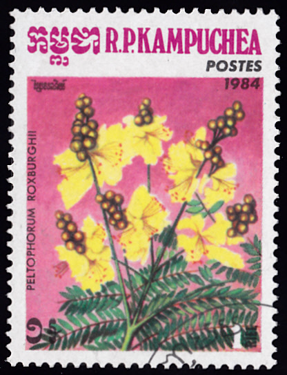 Diese Marke aus Kambodscha (MiNr 594= zeigt einen blühenden Zweig des Gelben Flammenbaumes (Peltophorum pterocarpum).