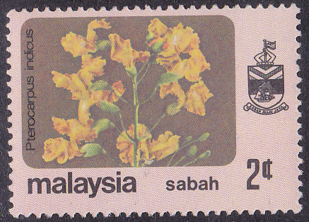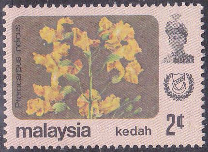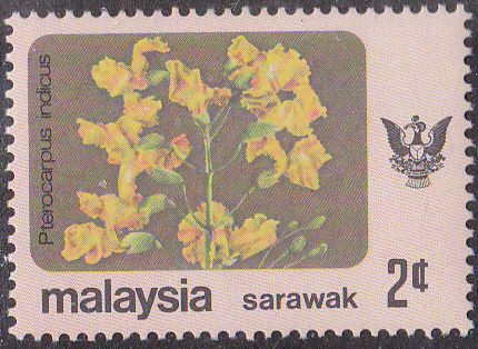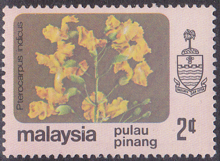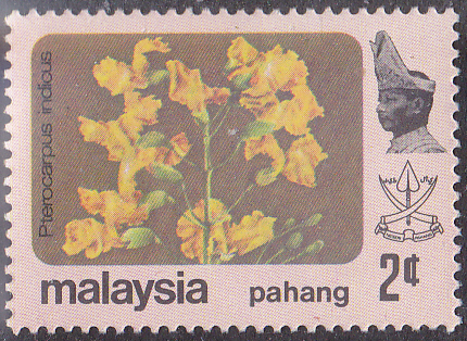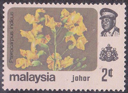 In den Malaiische Staaten V Malaienstaaten, Johor ist diese Marke (MiNr 169) mit Blüten des Narrabaumes (Pterocarpus indicus) erschienen.
