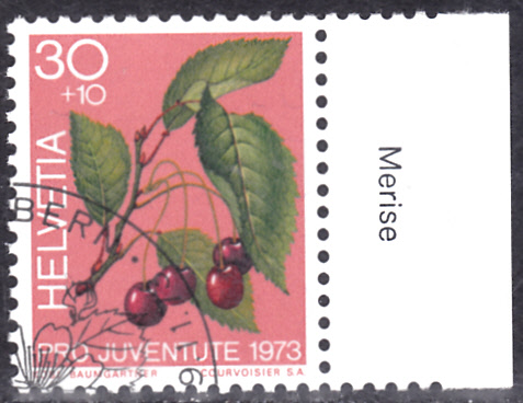 Die bereits gezeigte Marke aus der Schweiz (MiNr 1014) kann ich hier vom rechten Bogenrand zeigen. Auf dem Bogenrand ist das Markenbild beschrieben (merise (frz) = Süße Kirsche, Wildkirsche, Vogelkirsche).