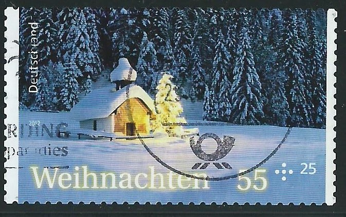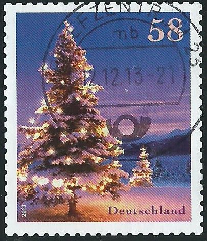 Und alle guten Dinge sind 3: Es darf wieder einmal eine Weihnachtsmarke herhalten, auf der eine schöne Winterlandschaft mit verschneiten Tanne zu sehen ist (Bund Mi.Nr. 2966):