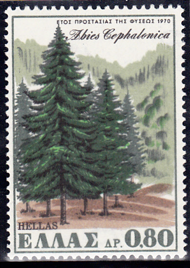 Diese Marke aus Griechenland (MiNr 1049) zum Europäischen Naturschutzjahr 1970 zeigt eine Griechische Tanne (Abies cephalonica) im Markenbild.