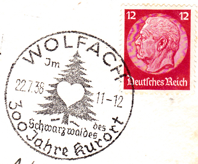 Handwerbestempel aus Wolfach vom 22.7.1938 mit einer Tanne im Stempelbild.