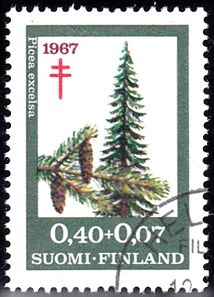 Diese Marke aus Finnland (MiNr 625) zeigt eine Gemeine Fichte oder Rotfichte (Picea abies auch Picea excelsa genannt) und einen Fichtenzweig.
