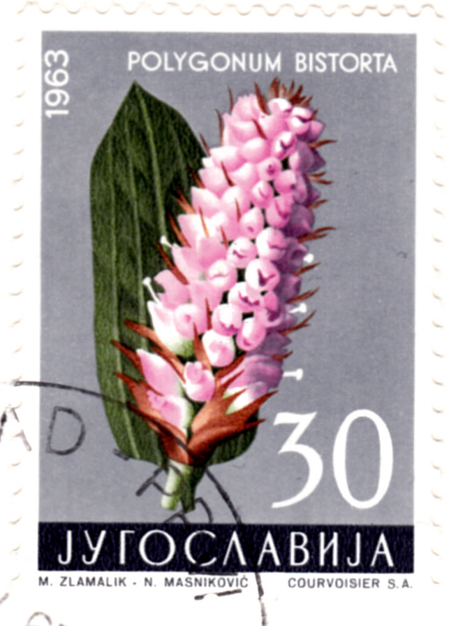 Auf dieser Marke aus Jugoslawien (MiNr 1036) ist ein Blütenstand des Schlangen-Knöterich (Bistorta officinalis) abgebildet.
