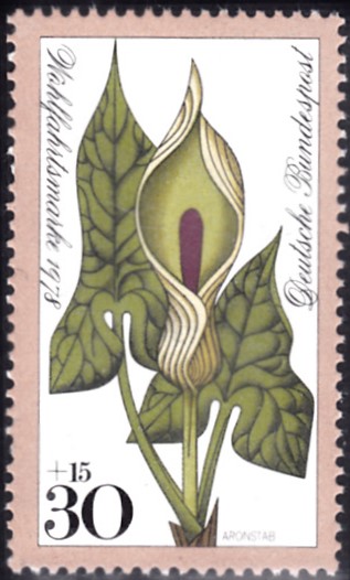 Auf dieser Marke aus der Wohlfahrtsmarkenserie 1978 der Deutschen Bundespost (MiNr 982) wird ein Gefleckter Aronstab (Arum maculatum) gezeigt.