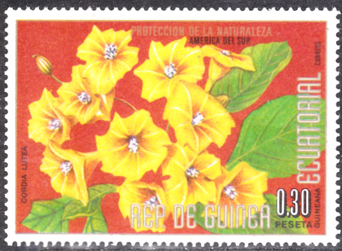 Auf dieser Marke aus Äquatorial-Guinea (MiNr 911) sehen wir Blüten einer Gelben Cordia (Coria lutea).